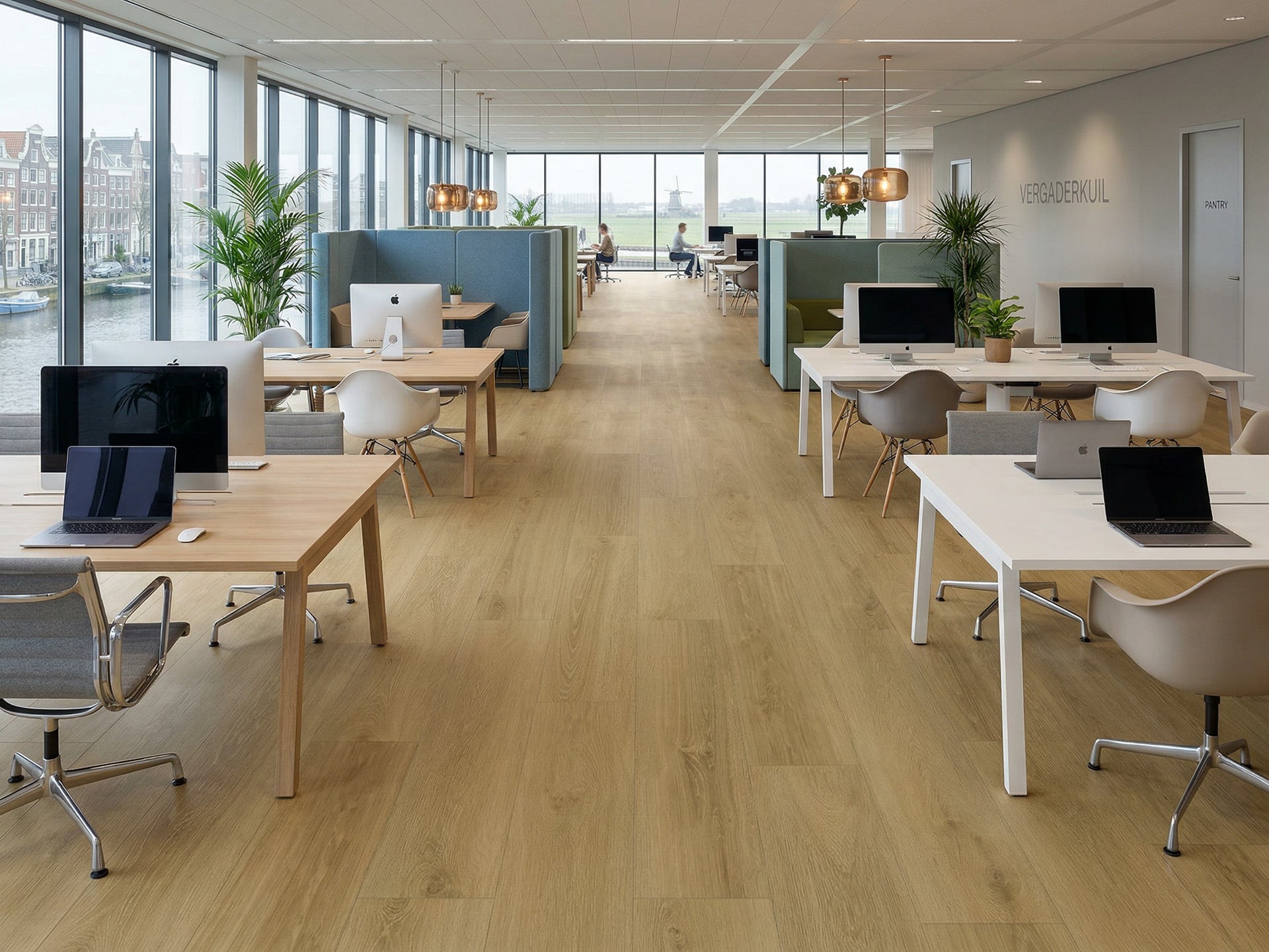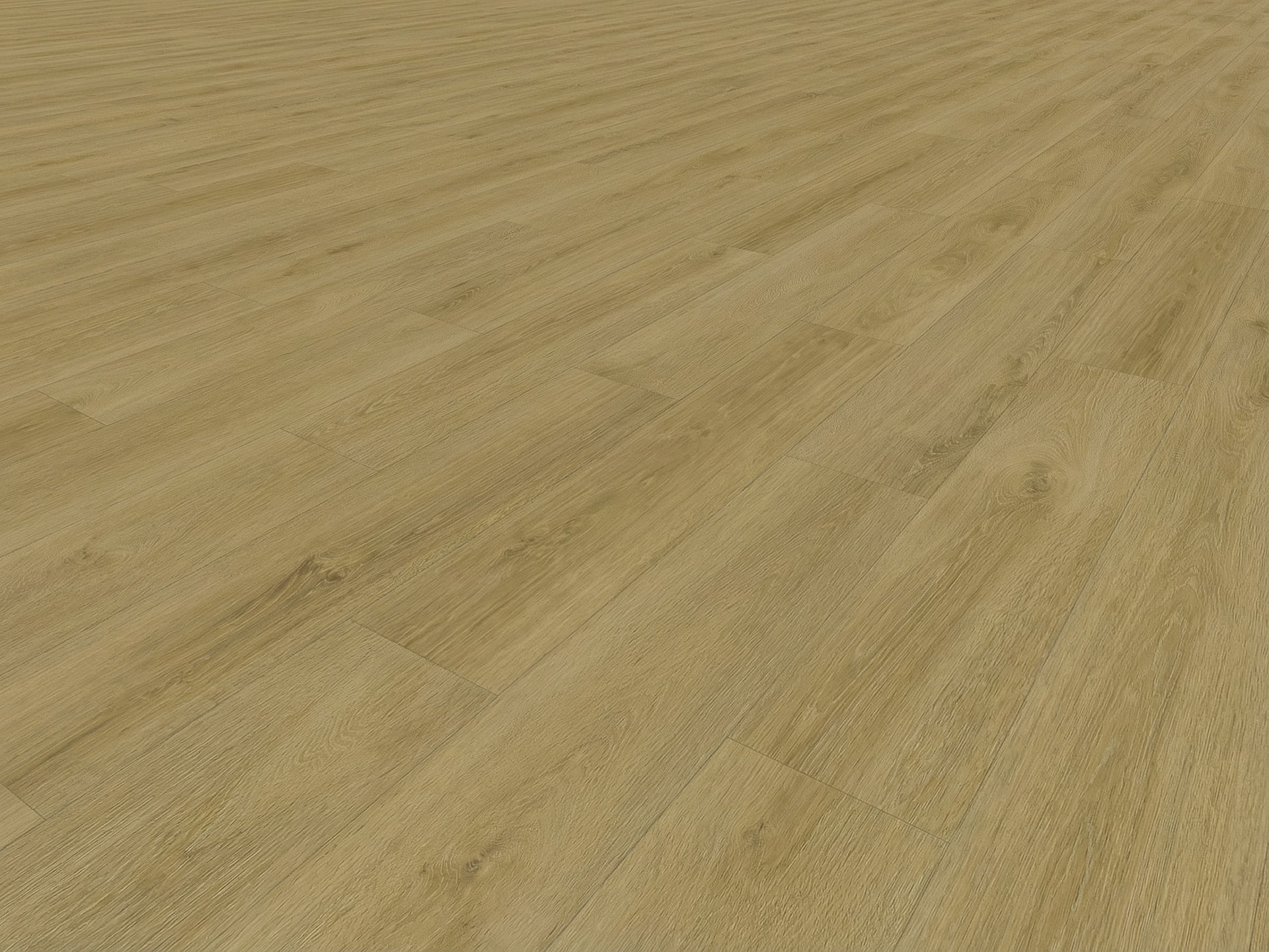 Deze vloer heeft een warme, naturel eiken kleur met een lichte goudbruine ondertoon. De planken tonen subtiele nerftekeningen en zachte kleurnuances, waardoor een rustige en natuurlijke uitstraling ontstaat. De tint brengt warmte in de ruimte zonder donker te worden en past moeiteloos in zowel moderne als klassieke interieurs.