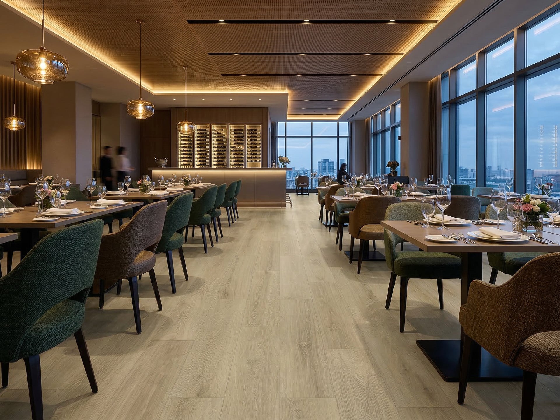Een zandkleurige eikentint met een zeer zachte, natuurlijke uitstraling. Perfect voor minimalistische en lichte interieurs. De subtiele houttekening zorgt voor rust en harmonie zonder af te leiden van het interieurdesign.